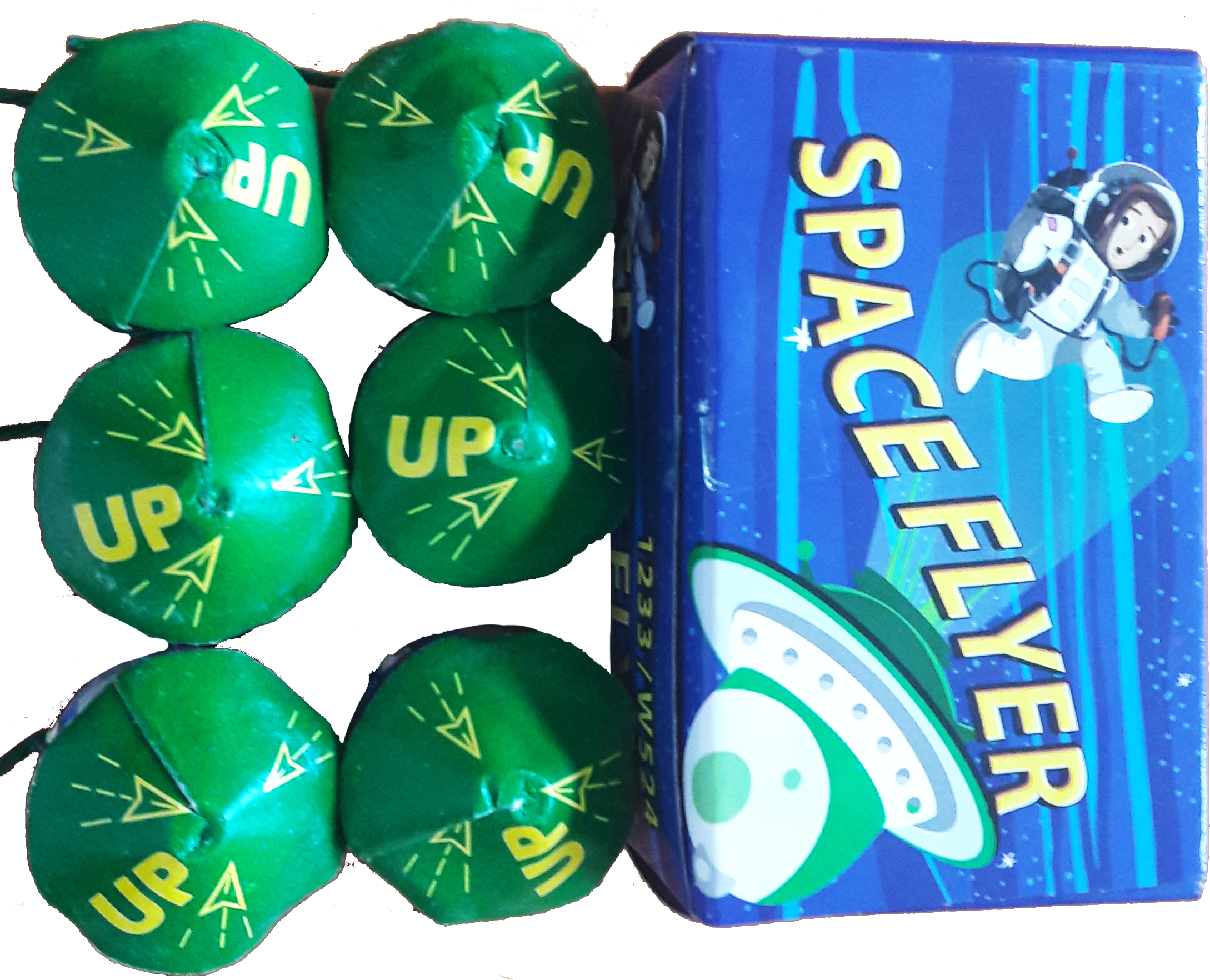 Space Flyer vagy elterjedtebb nevén, UFO. Színes, felszálló, fütyülő, forgó. A terméket mindig földön gyújtsuk meg, onnan kell indítani!